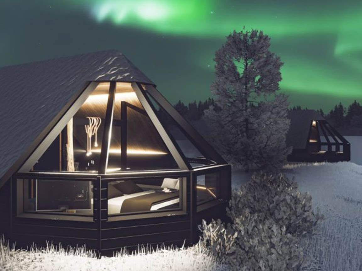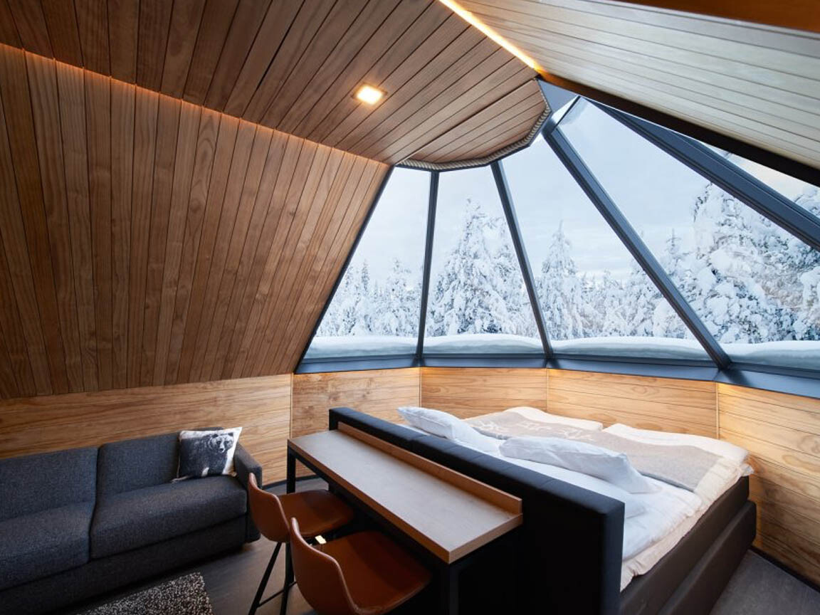 Glass Igloo Stay: Check in to the Northern Light Village Levi. You will stay in Aurora Cabins (glass igloos), giving you the chance to see the Northern Lights from your warm bed.